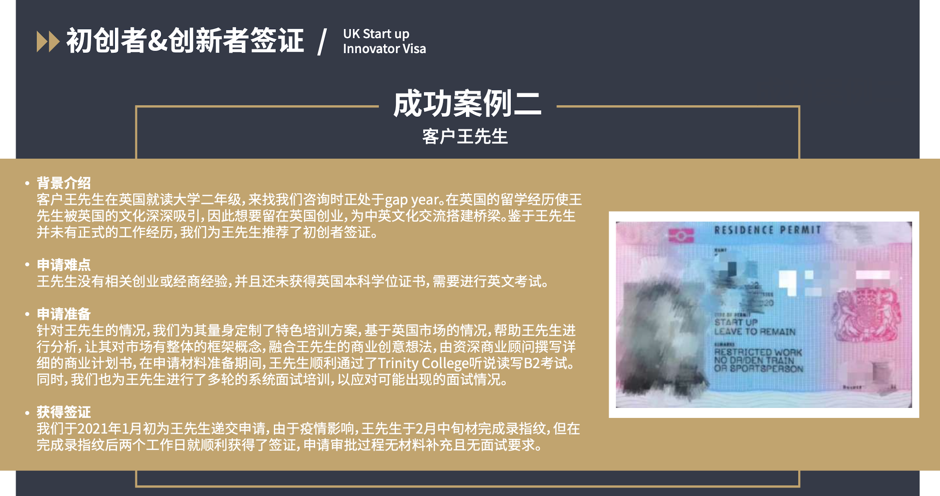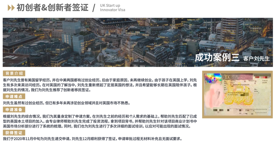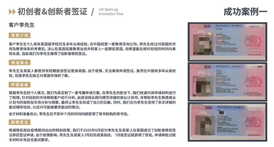提供优质的海外名校博士或博士后初创项目,投资人可以选择一个或多个项目进行投资,并作为该公司原始股东获得在英创新者签证,并可携带子女配偶前往英国,三年后即可获得英国永居资格。项目人可在英国自由开展和参与商业运作。签证服务由英国本地专业律师事务所全程负责,律所拥有多名经验丰富的英国律师和熟悉中英法律的最高级别法律顾问,在英国有良好的口碑。